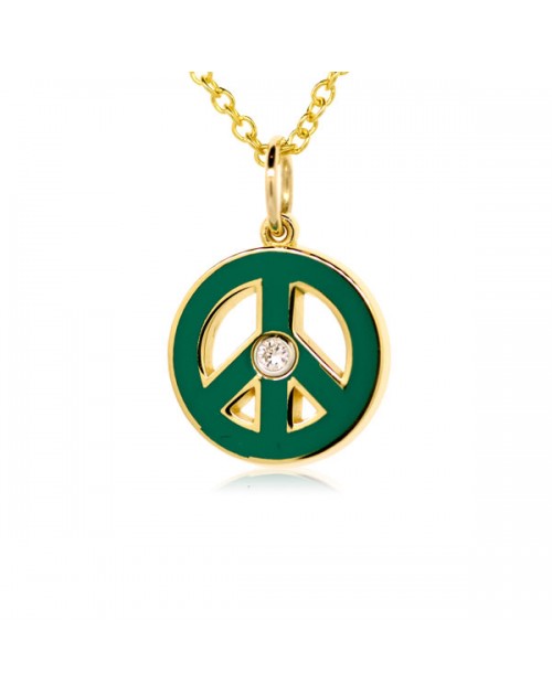18K yellow gold Peace charm with excellent quality full-cut diamond. This spectacular hand-crafted charm can be hung on a gold chain. All of our charms can also be made into post earrings and rings sized to your finger. Please email us for more information. 14mm x 10mm (dimensions include loop) The Peace sign is a worldwide symbol of global peace and earth-centered unity.   All French Enamel Charms are available in 13 colors. If you don't find the color you're looking for, please use the "Product Enquiry" button and let us know.  16" Chain INCLUDED.